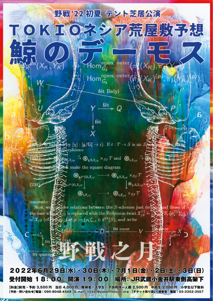 テント芝居の野戦之月のチラシ制作を数年担当していて、これまでは木版画をメインのイメージにしていたのですが、今回のタイトルが「TOKIOネシア荒屋敷予想《鯨のデーモス》」ということで、カメラ片手にスナップ写真を撮りつつ、TOKIOネシアを徘徊していました。言葉で考えることをやめて、感覚で東京を感じようと、延べ一週間ほど歩き続けて、それを捕らえるにはデカルコマニーが適していると思いついたのです。