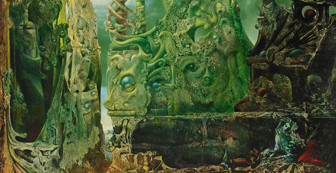 シュルレアリストの画家、オスカー・ドミンゲスが絵画技法として導入し、マックス・エルンストが数々の名作を生み出した〔デカルコマニー:décalcomanie〕。デカルコマニーはロールシャッハテストで使われる、インクを垂らした紙を折って圧着し、偶然のかたちをとりだすのと同じ原理です。