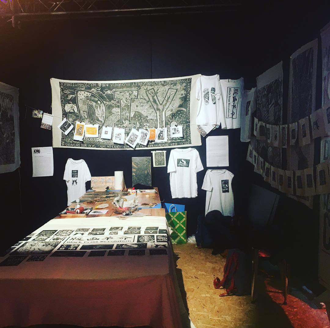 2月12日から17日までA3BCの木版画ワークショップを行うためにロンドンへ行ってきた。Lushという社会問題にも取り組むイギリスに本社のある企業のイベント「Lush Summit」に招待されたからだ。年末にインスタグラムのメッセージで届いた。現地の担当者はA3BCもバナーを出品していたロンドン・アナキスト・ブックフェアでSignalを見て招待を決めたそうだ。三人分の渡航費と滞在費を負担するという。とはいえ企業の行うイベントに参加することは少なからず抵抗感がある。先方のアイデアでは、社会運動支援のTシャツのデザインをお願いされたのだが、支援するならその運動を自分たちで理解して決めたいわけだし、そもそもお金を通した支援を行うつもりはないので、ワークショップを行えるなら参加すると伝える。それでも是非ということなので参加することにした。古い建築物を利用したイベントスペース4フロアーを贅沢に使った、主に各国の社員教育のための二日間で2千人規模のイベントで、全てが英語なので内容の深いところまでは確認できなかったが、かなり盛り上がっていた。二日間、各日三時間ずつのワークショップを行ったが、参加者は途切れることがなかったし、各国からの参加者がそれぞれの思いを木版画で表現していた。みんなの作品を刷った一枚の良いバナーが完成した。良い形で木版画やコレクティブの活動というものが伝わればいいと思う。コレクティブと企業との協働ということに関して結論を出すことは出来なかったが、勉強にはなった。これからもイデオロギーや貨幣に縛られることのないフットワークの軽さを持ち続けたいと思う。