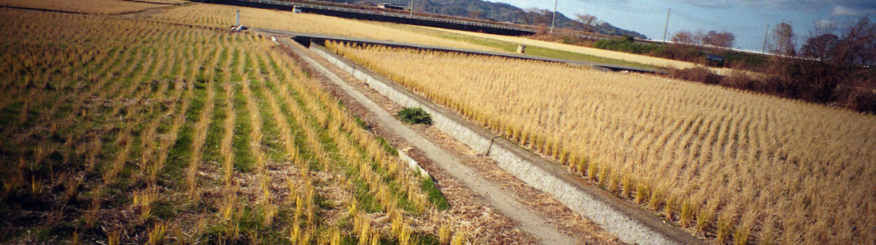 かつてルート196だった県道の気になった脇道に入ると、行き止まりに田園風景が広がる。40年近くにもなるだろうか、友人たちと堀江海岸の夜光虫を見にいこうと、夜遅くあぜ道を原付バイクで走った覚えがあるのは多分この田園だと思う。真っ暗なあぜ道に少女がたたずんでいたと騒いだ覚えがあるが、思春期の男子だけに見える幻影だったのだろう。今は整備され、あぜ道という感じではなくなっている。そこに少女がたたずむことはもうない。